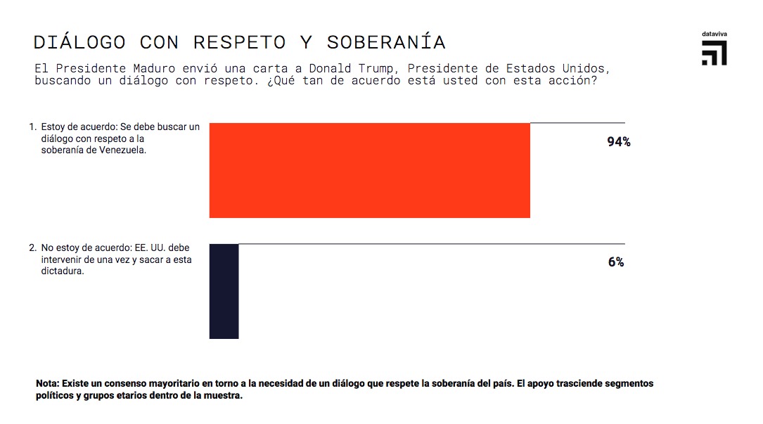 De acuerdo con los resultados, el 88 % de los consultados está de acuerdo con la carta enviada por el presidente Nicolás Maduro al presidente de Estados Unidos, Donald Trump, en la que propone un diálogo sobre la base del respeto mutuo y la independencia de Venezuela. Solo un 12 % se mostró en desacuerdo, considerando la intervención extranjera como una alternativa.