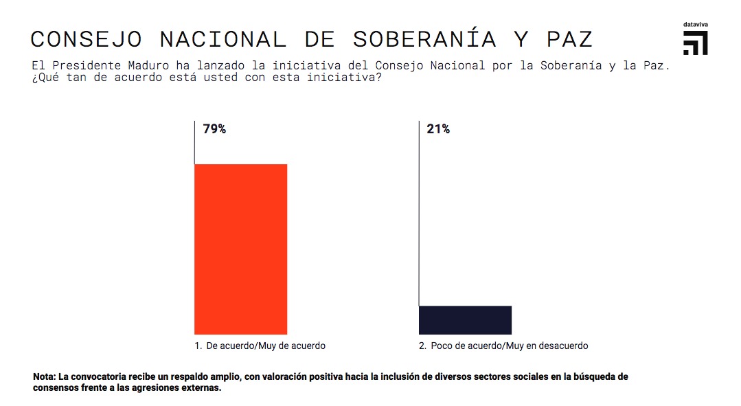 La medición también registró que el 79 % de los encuestados respalda la iniciativa del Consejo Nacional por la Soberanía y la Paz, concebido como un espacio de convocatoria amplia e incluyente de los distintos sectores sociales frente a las agresiones contra el país.