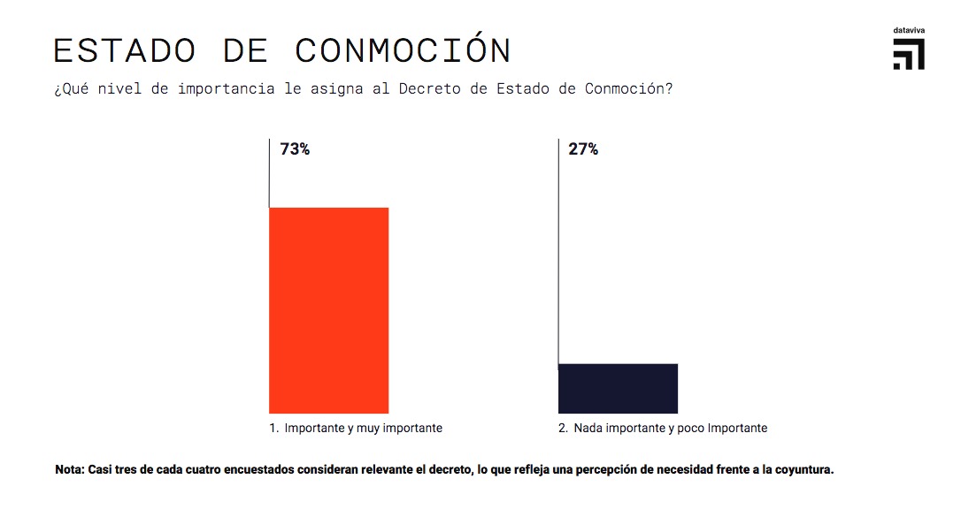 En cuanto al Decreto de Estado de Conmoción, el 73 % lo considera importante o muy importante, reflejando sensibilidad ciudadana ante la coyuntura y el respaldo a la adopción de medidas extraordinarias en defensa de la estabilidad nacional.
