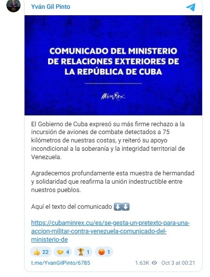 Asimismo, el Canciller de Venezuela, Yván Gil, también denunció que se trata de una grave provocación que coloca en riesgo la paz en la región y agradeció el pronunciamiento de apoyo del Gobierno cubano.