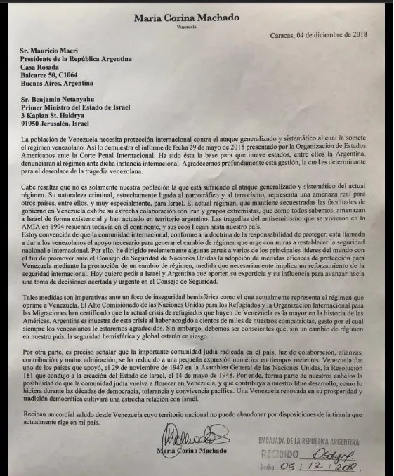 "He dirigido recientemente algunas cartas a varios de los principales líderes del mundo con el fin de promover ante el Consejo de Seguridad de Naciones Unidas la adopción de medidas eficaces de protección para Venezuela mediante la promoción de un cambio (...) Hoy quiero pedir a Israel y Argentina que aporten su experticia y su influencia para avanzar hacia una toma de decisiones acertada y urgente en el Consejo de Seguridad", fue parte del pedido que hizo María Machado en la carta.