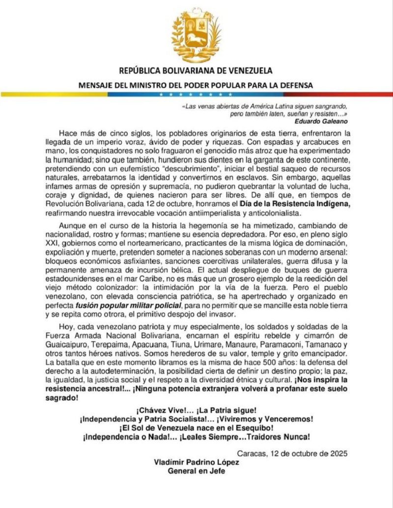 País.- El ministro de Defensa, Vladimir Padrino López expresó que la batalla que libra Venezuela en la actualidad es la misma de hace 500 años, estas declaraciones a propósito del Día de la Resistencia Indígena que se conmemora este 12-Oct en todos el territorio nacional.