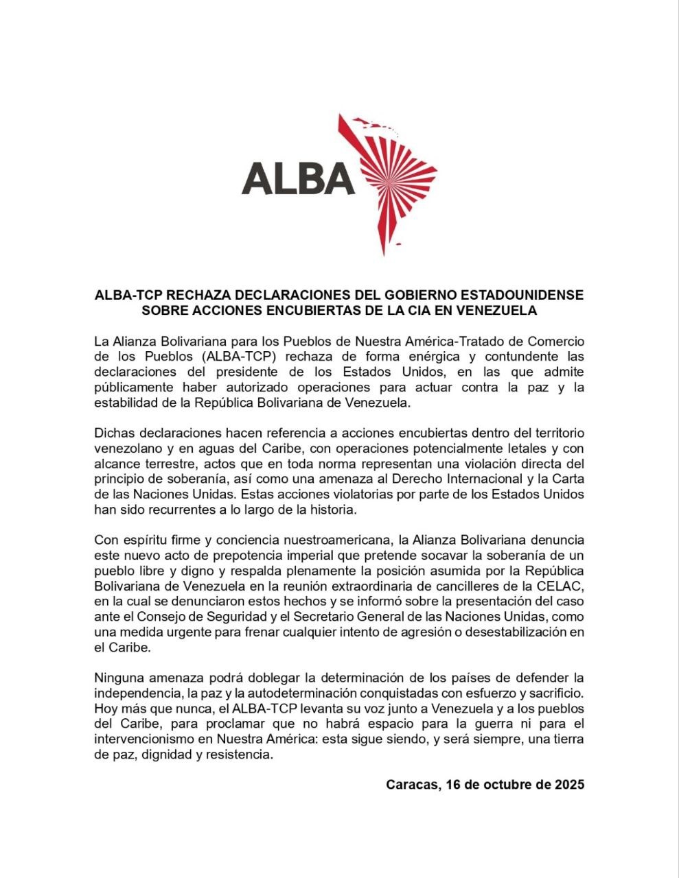 País.- La Alianza Bolivariana para los Pueblos de Nuestra América-Tratado de Comercio de los Pueblos (ALBA-TCP), mediante la divulgación de un comunicado oficial rechazó “de forma enérgica” la decisión del presidente de los Estados Unidos, Donald Trump, sobre las operaciones “encubiertas dentro del territorio venezolano y en aguas del Caribe”.