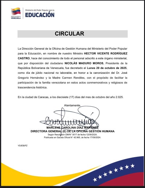 "La Dirección General de la Oficina de Gestión Humana del Ministerio del Poder Popular para la Educación, en nombre de nuestro ministro Héctor Rodríguez, hace del conocimiento de todo el personal adscrito a este órgano ministerial, que por disposición del ciudadano Nicolás Maduro, fue decretado el Lunes 20 de octubre de 2025, como día de jubilo nacional no laborable, en honor a la canonización del Dr. José Gregorio Hernández y la Madre Carmen Rendiles", reza la circular difundida por el ente ministerial.