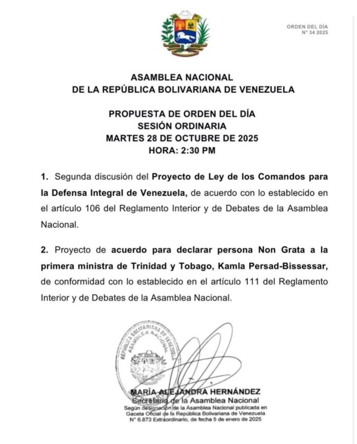 País.- Este martes 28 de octubre se tiene que previsto que a las 2:30 de la tarde, la Asamblea Nacional realice una sesión ordinaria en donde los parlamentarios discutirán declarar "persona non grata" a la primera ministra de Trinidad y Tobago, Kamla Persad-Bissessar.
