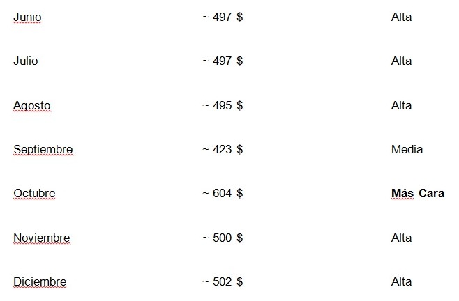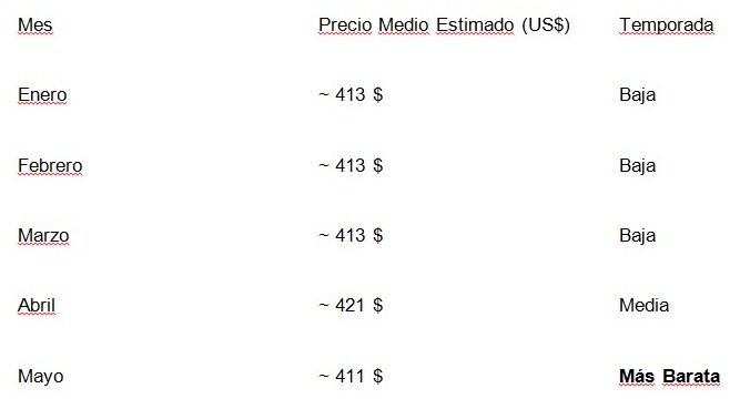 Enero, febrero, marzo y, sobre todo, mayo son los meses más económicos, puedes encontrar billetes en torno a 390 €. Incluso usuarios expertos en buscar vuelos recomiendan evitar la tentación de viajar en julio, agosto y octubre momentos con precios que saltan fácil hasta los 570 € o incluso más.