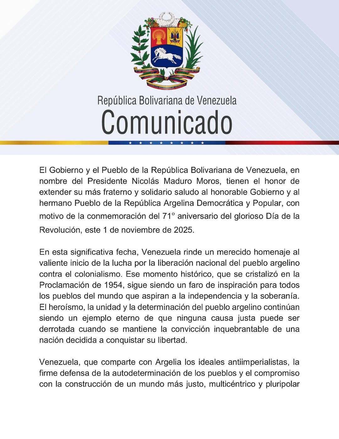"En esta significativa fecha, Venezuela rinde un merecido homenaje al valiente inicio de la lucha por la liberación nacional del pueblo argelino contra el colonialismo. Ese momento histórico, que se cristalizó en la Proclamación de 1954, sigue siendo un faro de inspiración para todos los pueblos del mundo que aspiran la independencia y la soberanía", resalta parte del comunicado.