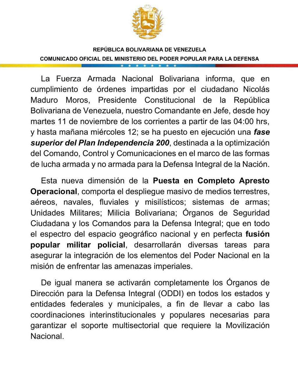 En cumplimiento de órdenes impartidas por el presidente Nicolás Maduro, “desde hoy martes 11 de noviembre de los corrientes a partir de las 04:00 hrs, y hasta mañana miércoles 12; se ha puesto en ejecución una fase superior del Plan Independencia 200, destinada a la optimización del Comando, Control y Comunicaciones en el marco de las formas de lucha armada y no armada para la Defensa Integral de la Nación”, dice el comunicado.