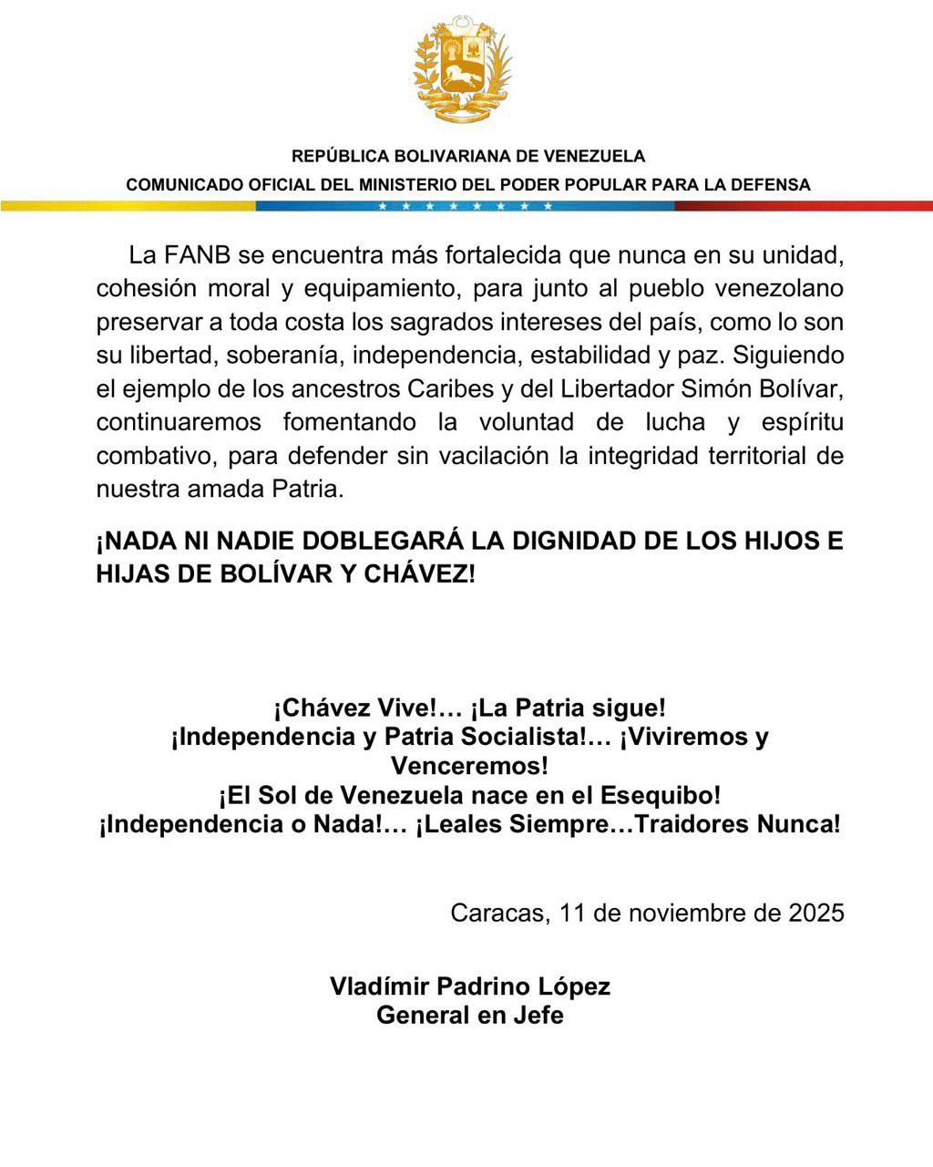 Concluye informando que “la FANB se encuentra más fortalecida que nunca en su unidad, cohesión moral y equipamiento, para junto al pueblo venezolano preservar a toda costa los sagrados intereses del país, como lo son su libertad, soberanía, independencia, estabilidad y paz”.