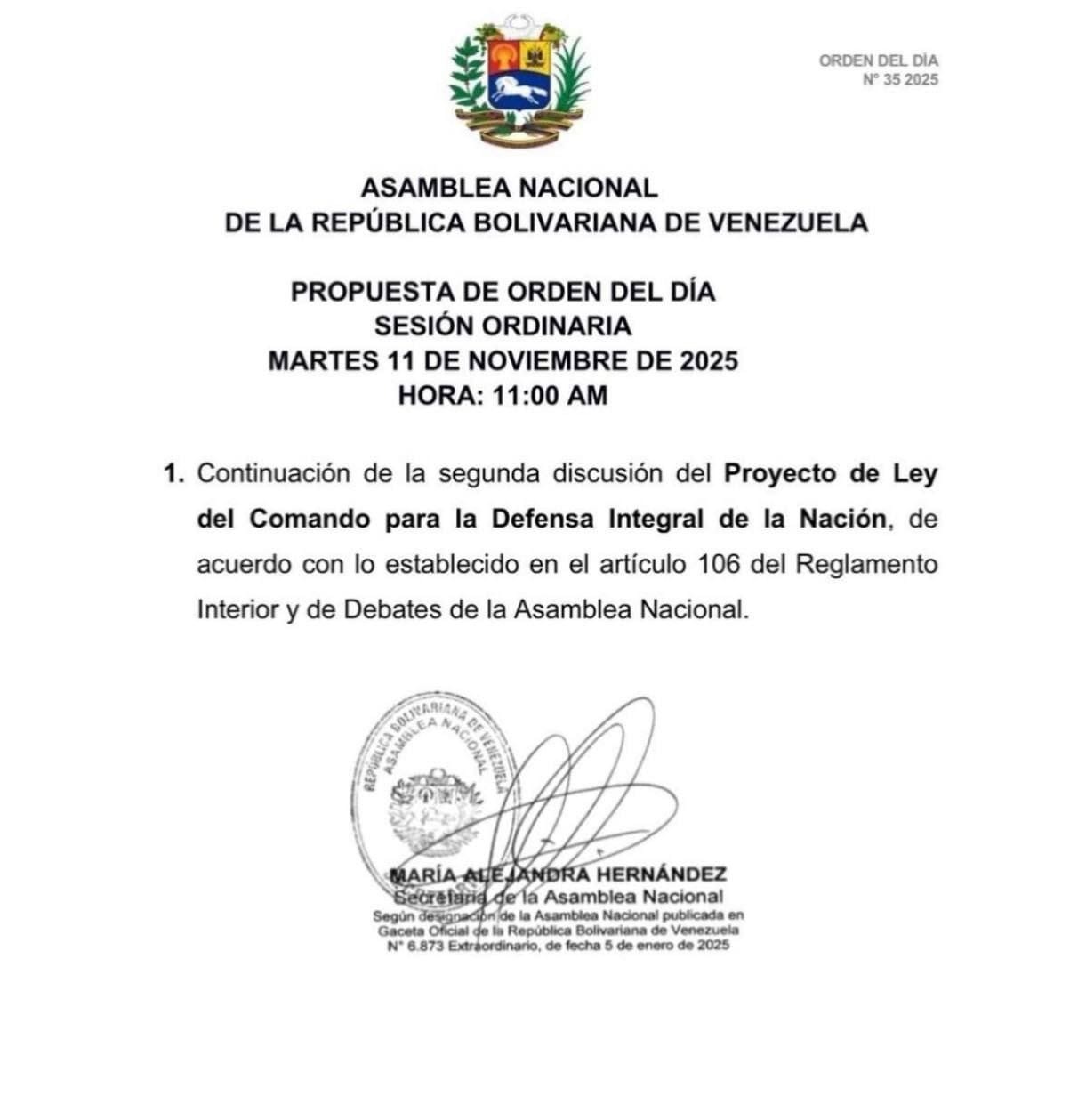 País.- Este marte 11 de noviembre se tiene previsto que la Asamblea Nacional (AN), realice una sesión ordinaria en donde los parlamentarios continuará en una segunda discusión el Proyecto de Ley del Comando para la Defensa Integral de la Nación.