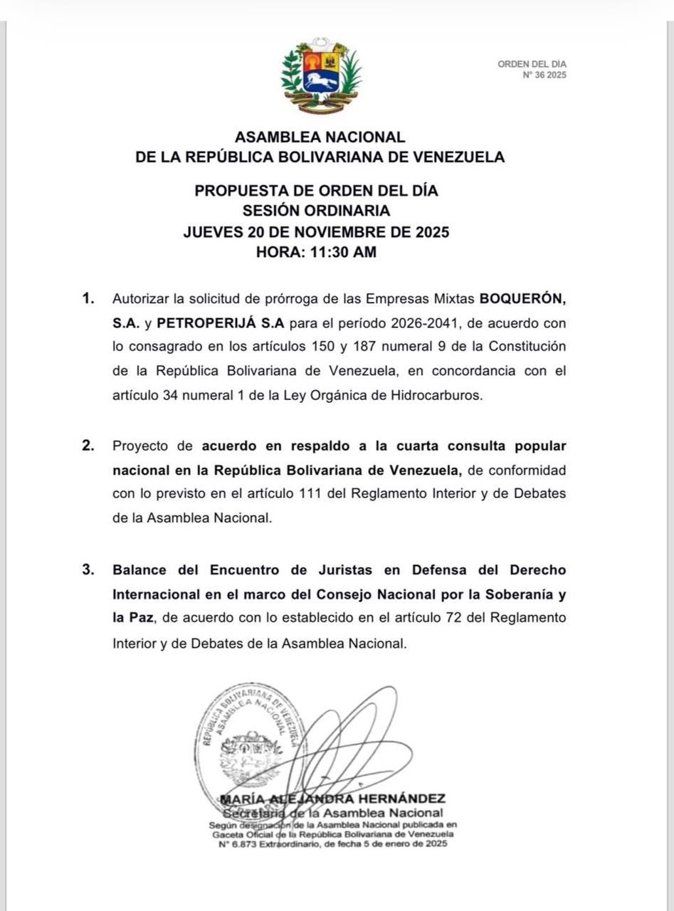 País.- Este jueves, se llevará a cabo una sesión ordinaria en la Asamblea Nacional (AN), para debatir la autorización de la solicitud de prórroga de las empresas mixtas como BOQUERÓN, S.A. y PETROPERIJÁ S.A., y el proyecto en respaldo a la cuarta Consulta Popular.