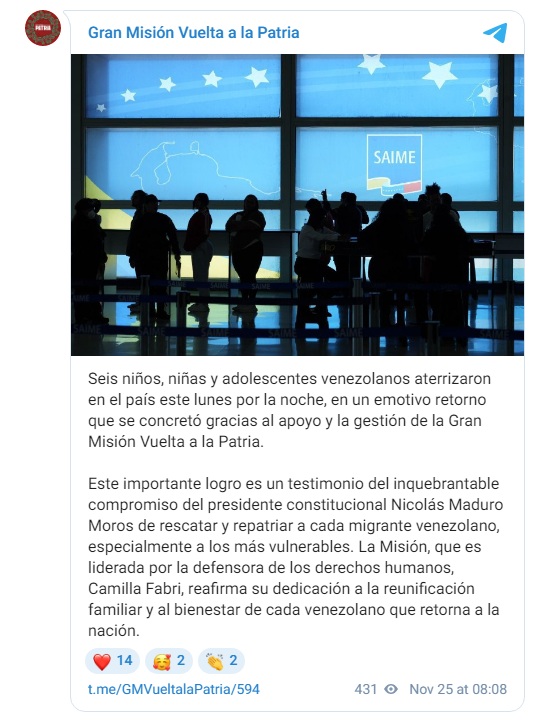 La llegada de los menores al país, fue anunciada por la iniciativa migratoria mediante un comunicado en su canal de Telegram "Este importante logro es un testimonio del inquebrantable compromiso del presidente constitucional Nicolás Maduro Moros de rescatar y repatriar a cada migrante venezolano, especialmente a los más vulnerables", expresa parte del texto.