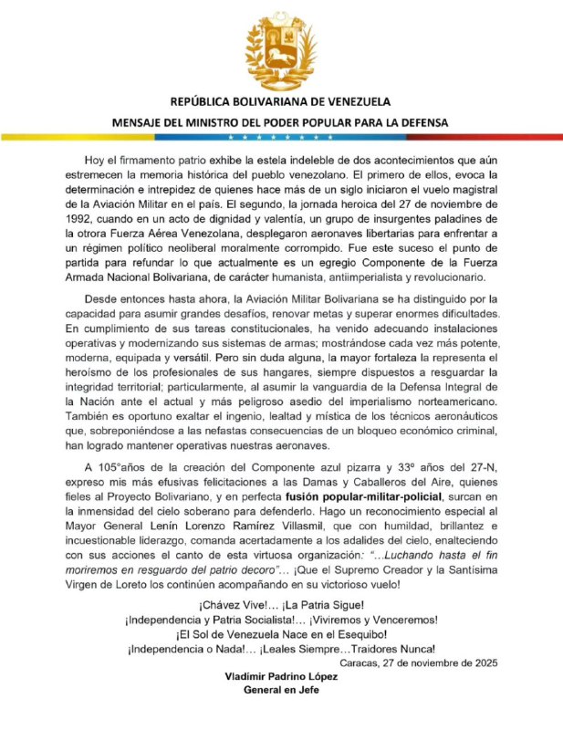"A 105 años de la creación del Componente azul pizarra y 33 años del 27-N, expreso mis más efusivas felicitaciones a las damas y caballeros del Aire, quienes fieles al Proyecto Bolivariano, y en perfecta fusión popular-militar-policial, surcan en la inmensidad del cielo soberano para defenderlo", añadió.