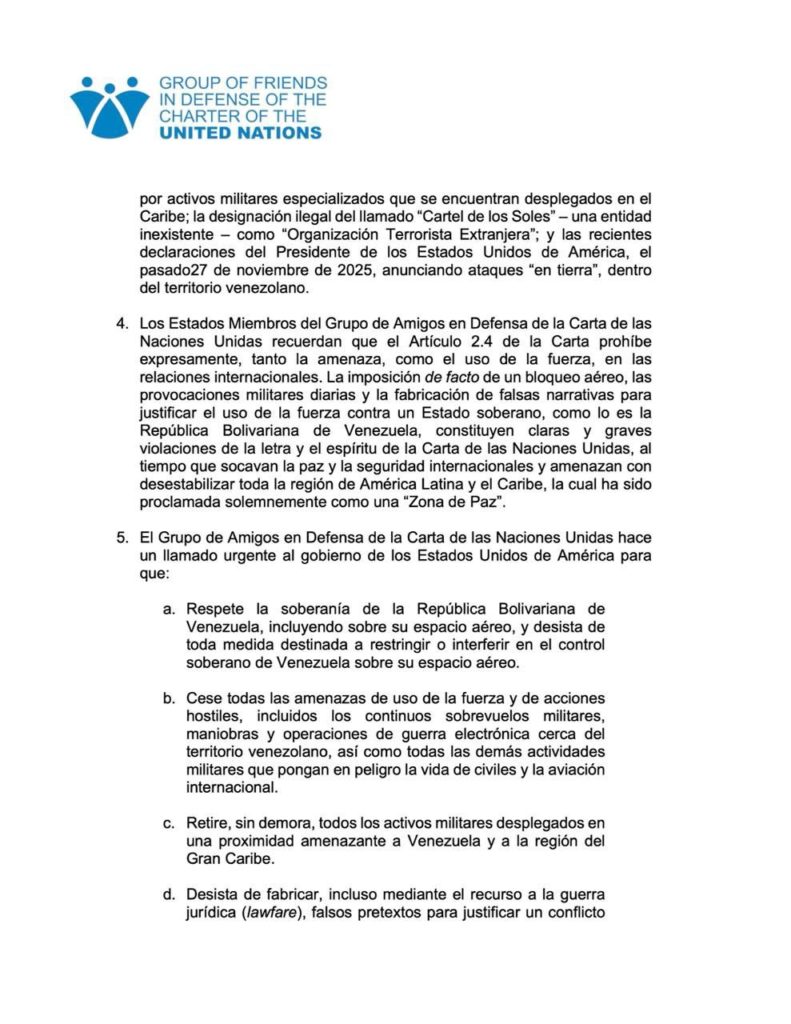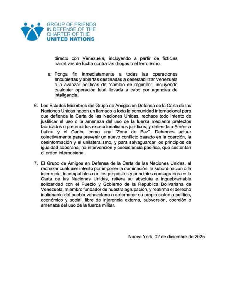Entre las exigencias de los países defensores de la Carta de la ONU, reclaman el cese de "narrativas ficticias de lucha contra las drogas o el terrorismo" y que ponga fin, "inmediatamente, a todas las operaciones encubiertas y abiertas destinadas a desestabilizar Venezuela o a avanzar políticas de ‘cambio de régimen’, incluyendo cualquier operación letal llevada a cabo por agencias de inteligencia".
