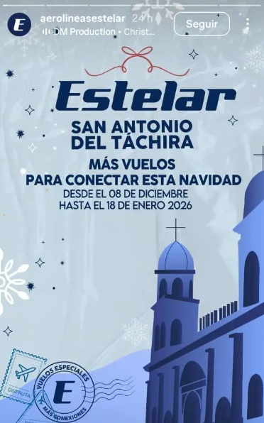 País.- La aerolínea de viajes Estelar, anunció una ampliación en la frecuencia de sus vuelos entre Caracas y Táchira, la cual estará disponible a partir de este lunes 8 de diciembre, incorporándose cuatro nuevas ventanas de traslado. Esto en respuesta a la contingencia emitida por las amenazas del gobierno norteamericano.