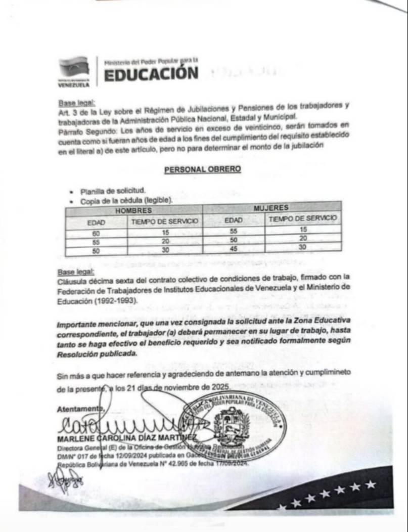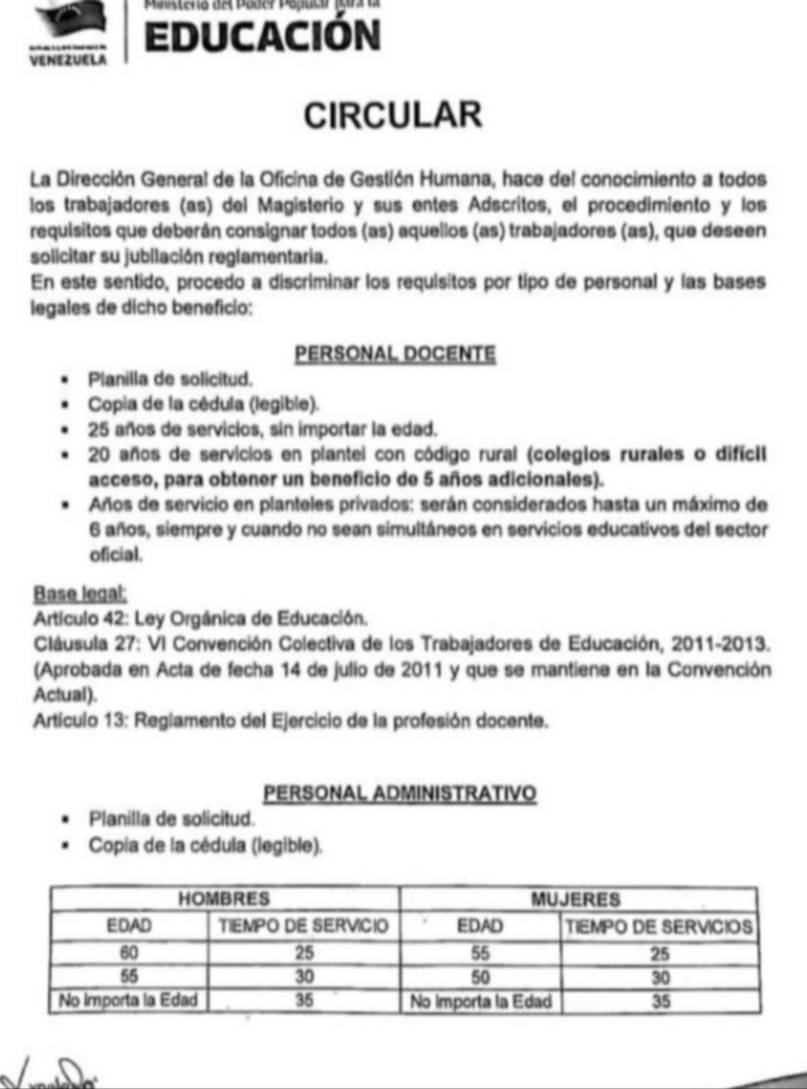 País.- El Ministerio para la Educación a través de la dirección general de la Oficina de Gestión Humana, dio a conocer los requisitos que deben consignar los docentes y personal obrero para solicitar la jubilación.