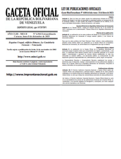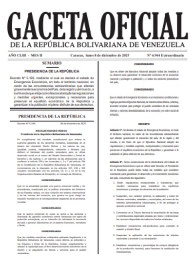 La medida fue oficializada en la Gaceta Oficial Extraordinaria N° 6.944, con fecha del pasado 8 de diciembre. Esta extensión sigue a prórrogas anteriores emitidas en agosto y octubre de 2025.