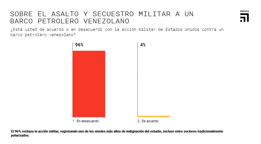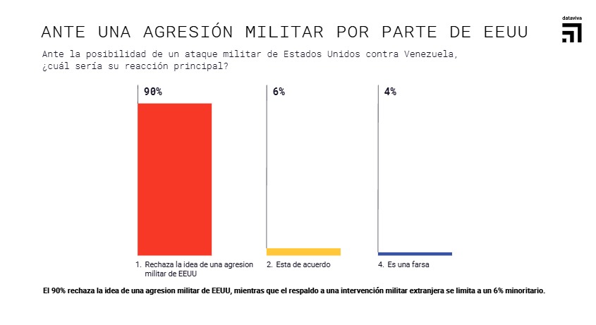 Asimismo, los resultados muestran que las posiciones asociadas al liderazgo de María Corina Machado se encuentran desalineadas con la postura mayoritaria del país frente a escenarios de confrontación externa. El estudio registra que el 90 % de los encuestados rechaza la idea de una agresión militar extranjera contra Venezuela, mientras que solo un 6 % expresa apoyo a ese tipo de intervención, reforzando la percepción de que las narrativas vinculadas a la confrontación carecen de respaldo ciudadano significativo.
