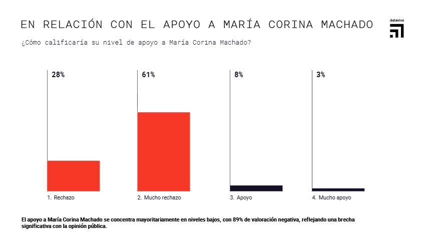 De acuerdo con los datos, el 89 % de los entrevistados califica su nivel de apoyo a María Corina Machado como bajo o muy bajo, distribuido entre 61 % que expresa “mucho rechazo” y 28 % que señala “rechazo”, mientras que solo un 11 % manifiesta algún nivel de apoyo (8 % “apoyo” y 3 % “mucho apoyo”). Esta distribución evidencia que el respaldo a la dirigente se encuentra concentrado en un segmento claramente minoritario de la población.