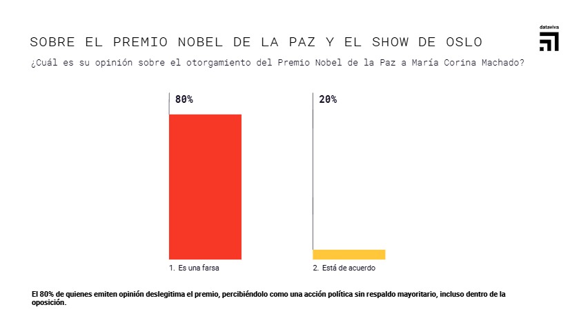 La encuesta también revela una deslegitimación mayoritaria del Premio Nobel de la Paz otorgado a Machado. Entre quienes emiten opinión, el 80% considera que dicho reconocimiento es una farsa, percibiéndolo como una acción política sin respaldo social amplio ni capacidad de cohesión, incluso dentro de sectores de la propia oposición.
