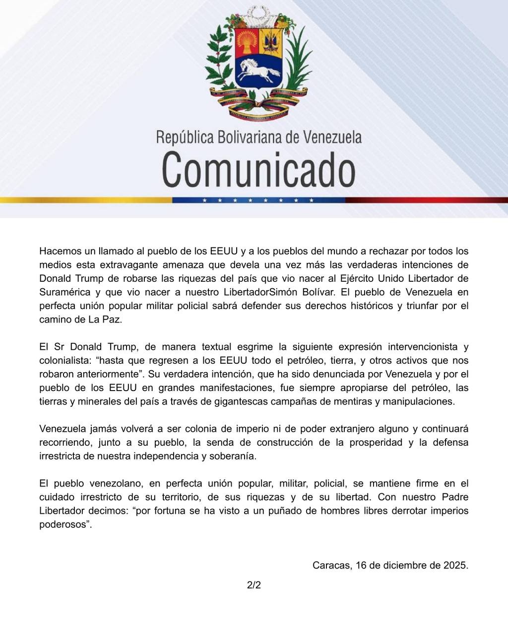 País.- El Gobierno Nacional rechazó y denunció a través de un comunicado las amenazas emitidas por el presidente de Estados Unidos, Donald Trump, este martes 16 de diciembre, quien pretende imponer un supuesto bloqueo militar naval a Venezuela.