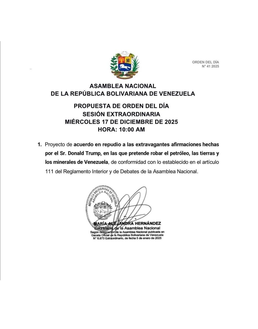 La propuesta de Orden del Día, tienen como único punto a tratar un "Proyecto de acuerdo en repudio a las extravagantes afirmaciones hechas por el Sr. Donald Trump" por pretender "robar el petróleo, las tierras y los minerales de Venezuela.