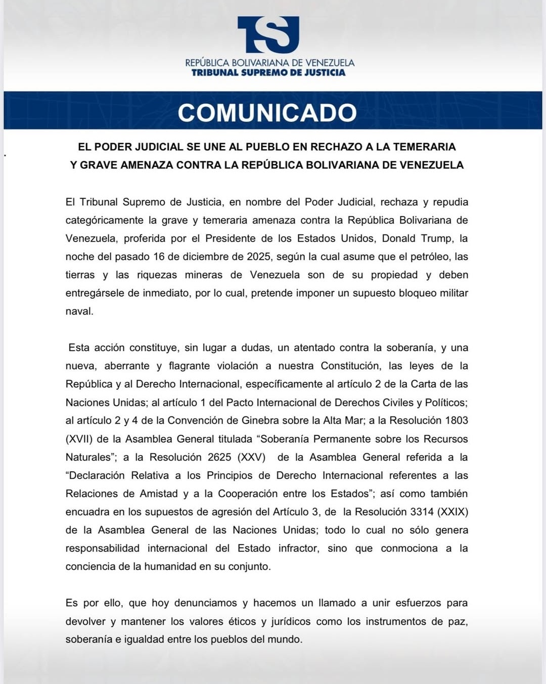 País.- Este miércoles 17 de diciembre, El Tribunal Supremo de Justicia (TSJ) de Venezuela emitió un comunicado oficial donde manifiesta su rechazo a las recientes declaraciones y amenazas realizadas por el presidente de los Estados Unidos, Donald Trump.