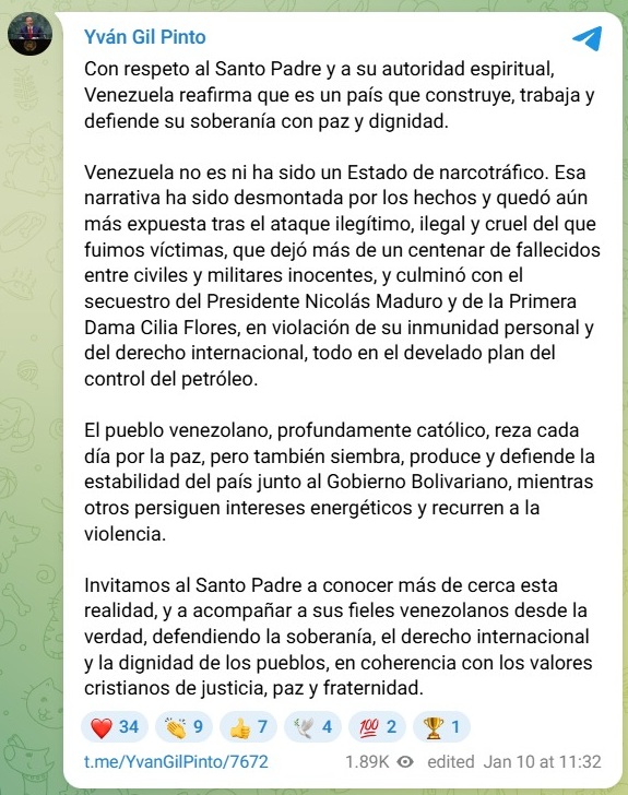“Con respeto al Santo Padre y a su autoridad espiritual, Venezuela reafirma que es un país que defiende su soberanía con paz y dignidad”, expresó Gil, al tiempo que destacó el carácter profundamente católico del pueblo venezolano, que afirmó reza diariamente por la paz, pero también siembra, produce y defiende la estabilidad del país junto al Gobierno Bolivariano.