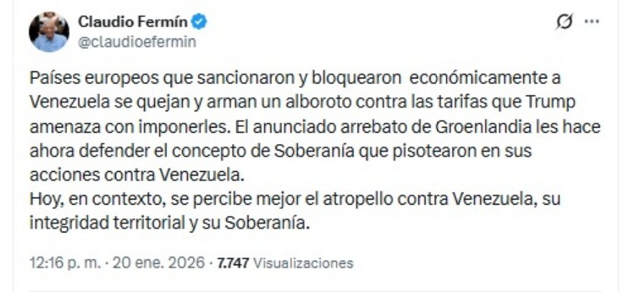 "Países europeos que sancionaron y bloquearon económicamente a Venezuela se quejan y arman un alboroto contra las tarifas que Trump amenaza con imponerles", escribió Fermín a través de su cuenta en la red social X.