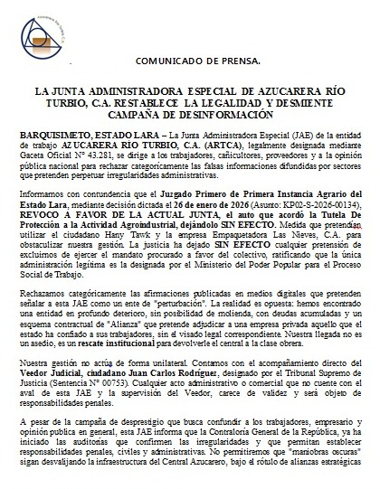 "Informamos con contundencia que el Juzgado Primero de Primera Instancia Agrario del Estado Lara, mediante decisión dictada el 26 de enero de 2026 (Asunto: KP02-S-2026-00134), REVOCO A FAVOR DE LA ACTUAL JUNTA, el auto que acordó la Tutela De Protección a la Actividad Agroindustrial, dejándolo SIN EFECTO. Medida que pretendían utilizar el ciudadano Hany Tawk y la empresa Empaquetadora Las Nieves, C.A. para obstaculizar nuestra gestión. La justicia ha dejado SIN EFECTO cualquier pretensión de excluirnos de ejercer el mandato procurado a favor del colectivo, ratificando que la única administración legítima es la designada por el Ministerio del Poder Popular para el Proceso Social de Trabajo", reza el comunicado de prensa emitido por Junta Administradora Especial de la empresa.
