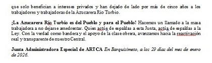 Finalmente, manifiesta que "A pesar de la campaña de desprestigio que busca confundir a los trabajadores, empresario y opinión publica en general, esta JAE informa que la Contraloría General de la República, ya ha iniciado las auditorías que confirmen las irregularidades y que permitan establecer responsabilidades penales, civiles y administrativas. No permitiremos que "maniobras oscuras" sigan desvalijando la infraestructura del Central Azucarero, bajo el rótulo de alianzas estratégicas que solo benefician a intereses privados y han dejado de lado por mas de cinco años a los trabajadores y trabajadoras de la Azucarera Río Turbio".