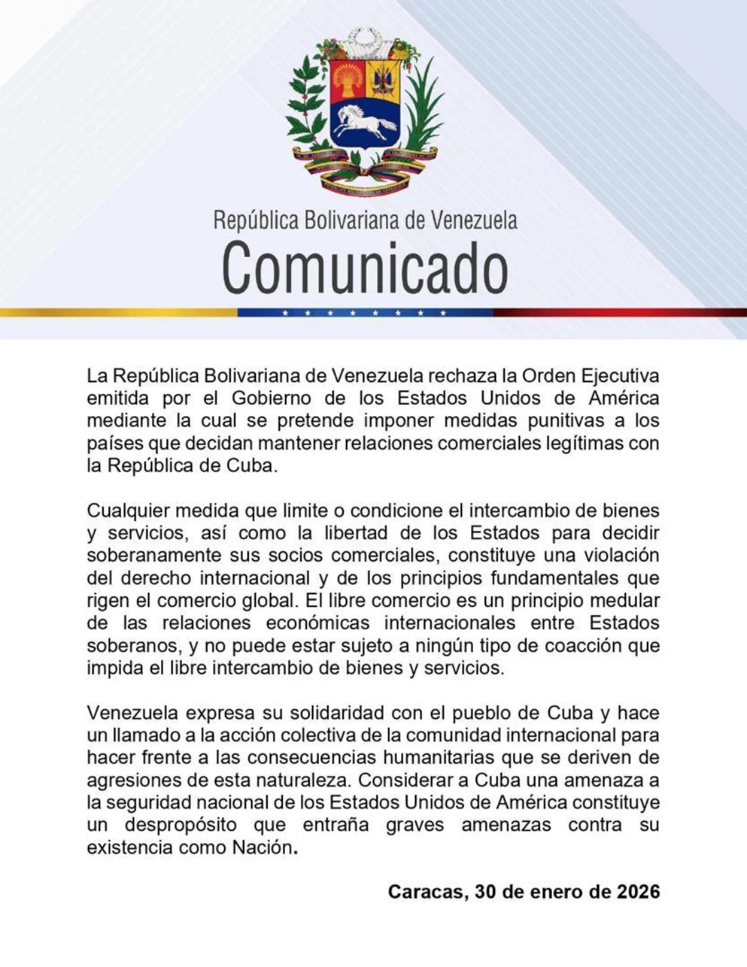 País.- A través de un comunicado, “la República Bolivariana de Venezuela rechaza la Orden Ejecutiva emitida por el Gobierno de los Estados Unidos de América mediante la cual se pretende imponer medidas punitivas a los países que decidan mantener relaciones comerciales legítimas con la República de Cuba”.
