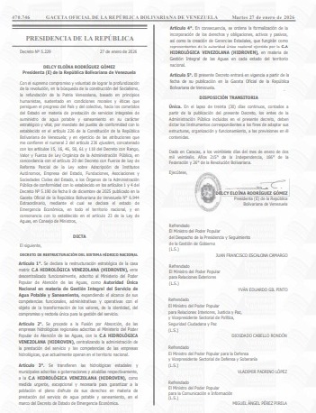 País.- De acuerdo a decreto Presidencial N.º 5.229, publicado en la Gaceta Oficial N.º 43.304, de fecha 27 de enero de 2026, la presidenta encargada, Delcy Rodríguez decretó la reestructuración estratégica de todo el sistema hidrológico de Venezuela, al ordenar la fusión inmediata de todas las empresas estadales y municipales para que la estatal C.A. Hidrológica Venezolana (Hidroven) las absorba.