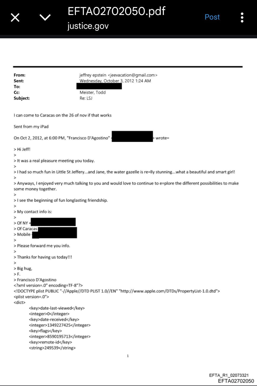 "Puedo ir a Caracas el 26 de noviembre si eso funciona", le escribió en una comunicación Epstein a D'Agostino en el año 2012, en respuesta a unas pedófilas afirmaciones que le había enviado el criollo: