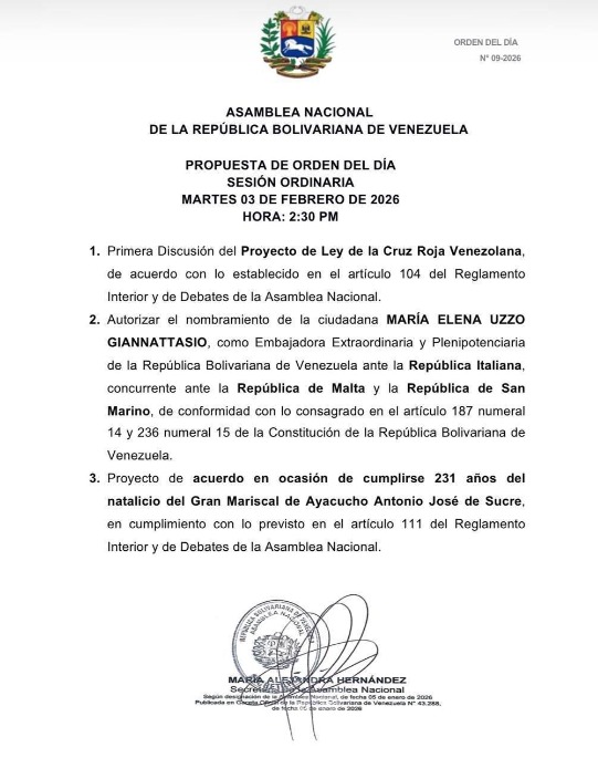 Como segundo punto, la plenaria autorizará la designación de María Elena Uzzo Giannattasio como nueva embajadora ante Italia, con concurrencia en Malta y San Marino, cumpliendo así con las facultades constitucionales del Legislativo.
