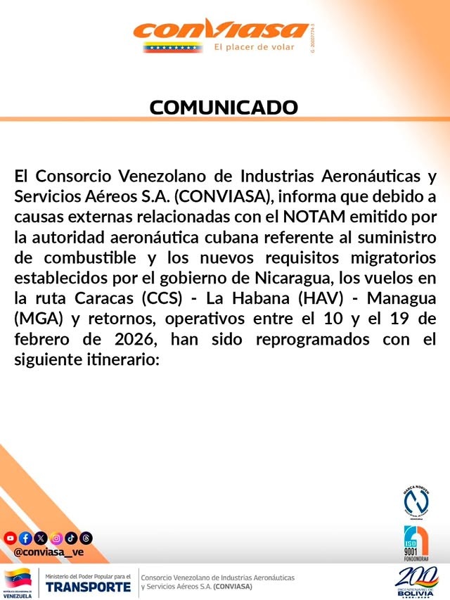 País.- El Consorcio Venezolano de Industrias Aeronáuticas y Servicios Aéreos S.A. (Conviasa), anunció este martes que reprogramará sus vuelos previstos hacia y desde Cuba entre el 10 y 19 de febrero, tras la crisis por la falta de combustible de aviación en los aeropuertos de la isla debido al asedio petrolero de Estados Unidos.