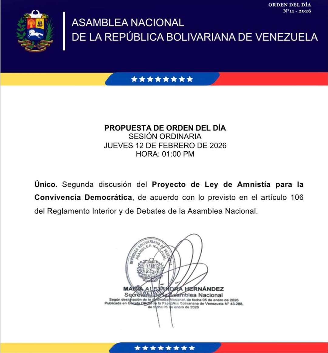País.- La Asamblea Nacional (AN) convocó para este jueves 12 de febrero, la segunda discusión de la reforma del Proyecto de Ley de Amnistía propuesta por la presidenta encargada, Delcy Rodríguez.