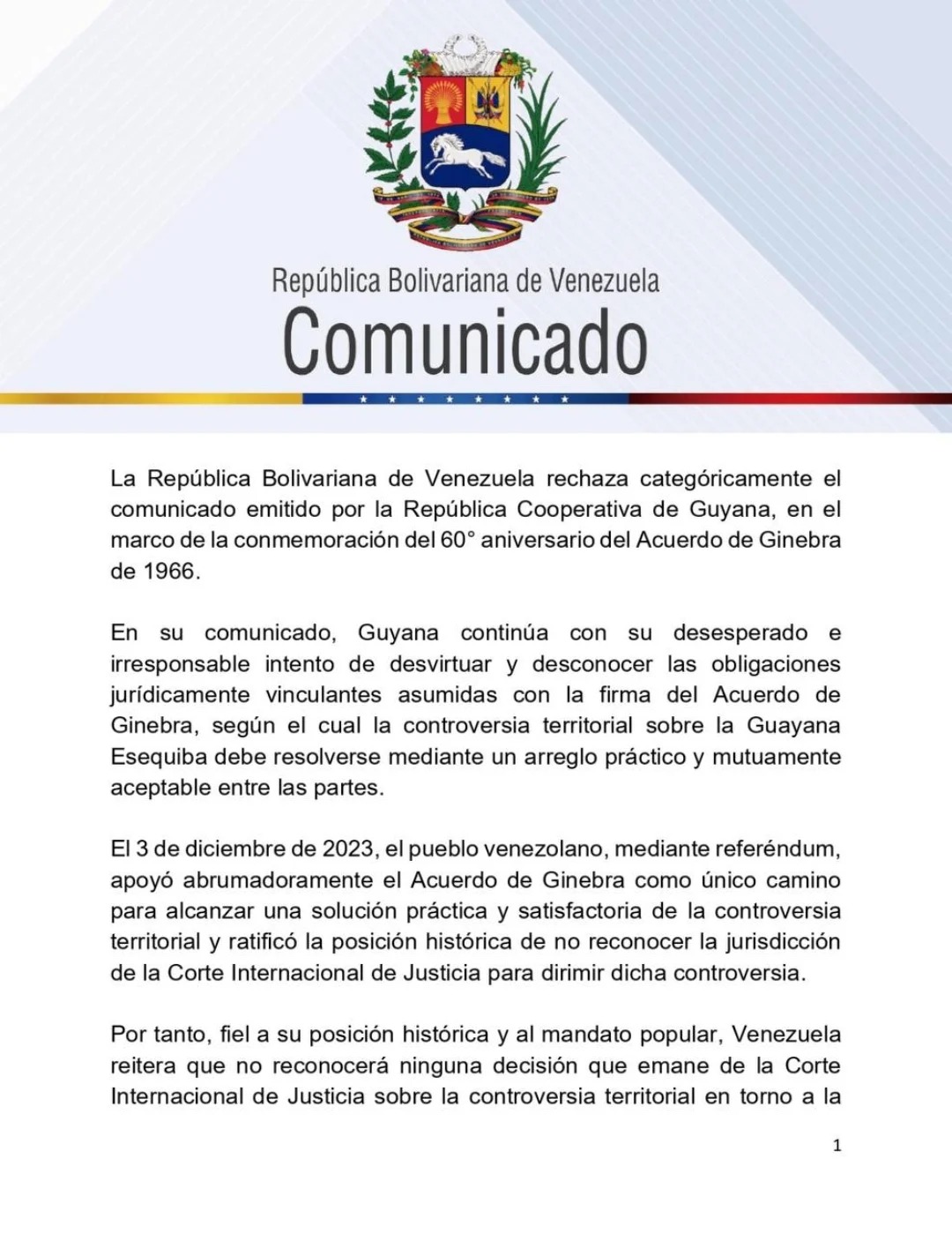 El texto publicado recuerda que el pueblo venezolano ratificó, mediante referéndum consultivo realizado el 3 de diciembre de 2023, su posición de no reconocer la jurisdicción de la Corte Internacional de Justicia (CIJ) para dirimir esta controversia.