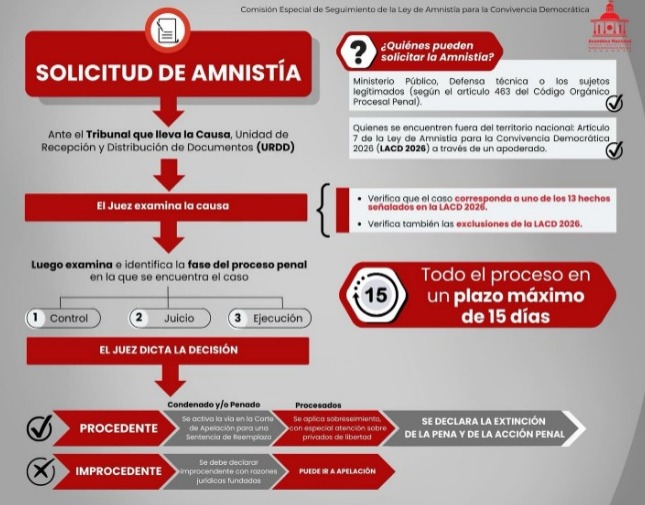 Por su parte, el presidente de la comisión parlamentaria para la aplicación de la norma, Jorge Arreaza publicó en redes sociales un flujograma donde se explica que quiénes están facultados para realizar la solicitud, cómo se desarrolla el trámite dentro del sistema judicial y cuáles son los lapsos establecidos para que los tribunales emitan una decisión.