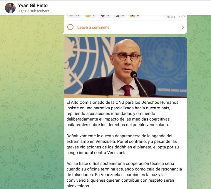 "El alto comisionado de la ONU para los Derechos Humanos insiste en una narrativa parcializada hacia nuestro país, repitiendo acusaciones infundadas y omitiendo deliberadamente el impacto de las medidas coercitivas unilaterales sobre los derechos del pueblo venezolano", dijo Gil en un mensaje difundido su canal de Telegram, que acompañó con una foto de Türk.