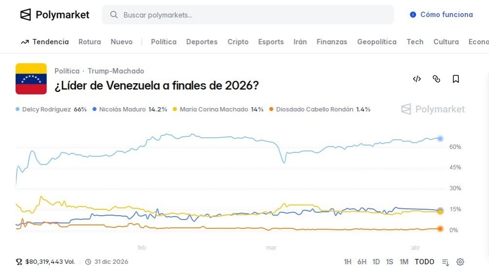 Los datos más recientes destacan que la mandataria encargada concentra alrededor del 66 % de probabilidad, cifra que se ubica muy por encima del resto de figuras evaluadas en la plataforma. En un segundo nivel aparecen el presidente, Nicolás Maduro.