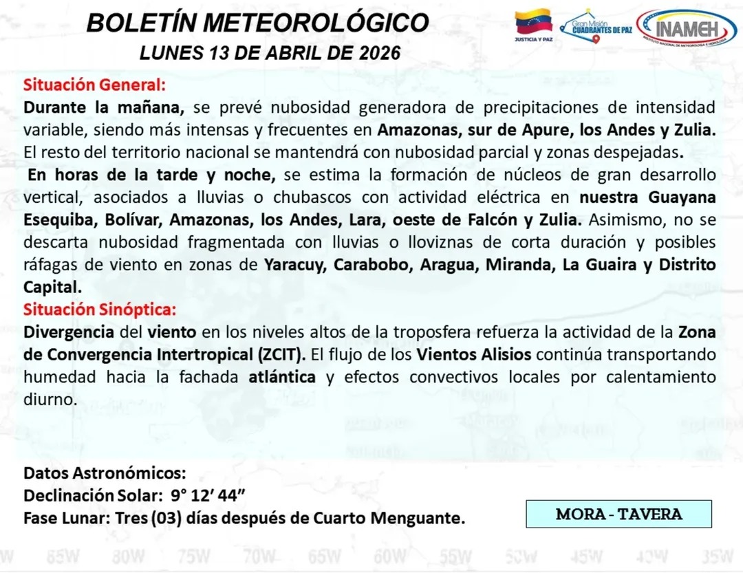 El organismo meteorológico, indicó que en horas de la tarde-noche se esperan lluvias o chubasco con actividad eléctrica en Guayana Esequiba, Bolívar, Amazonas, los Andes, Lara, oeste de Falcón y Zulia.
