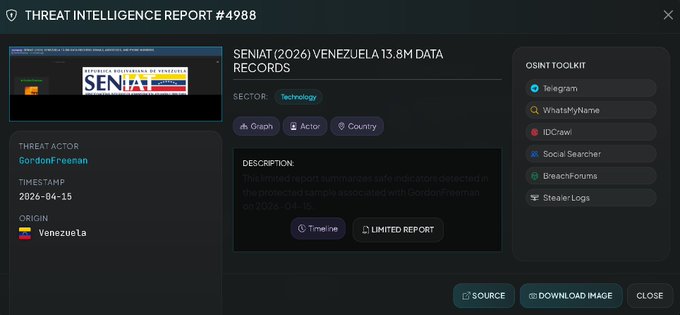 País.- Un actor de ciberamenazas, identificado como “GordonFreeman”, filtró este martes una base de datos masiva del Servicio Nacional Integrado de Administración Aduanera y Tributaria (Seniat), con información de al menos 13,8 millones de contribuyentes venezolanos, entre personas naturales y jurídicas.
