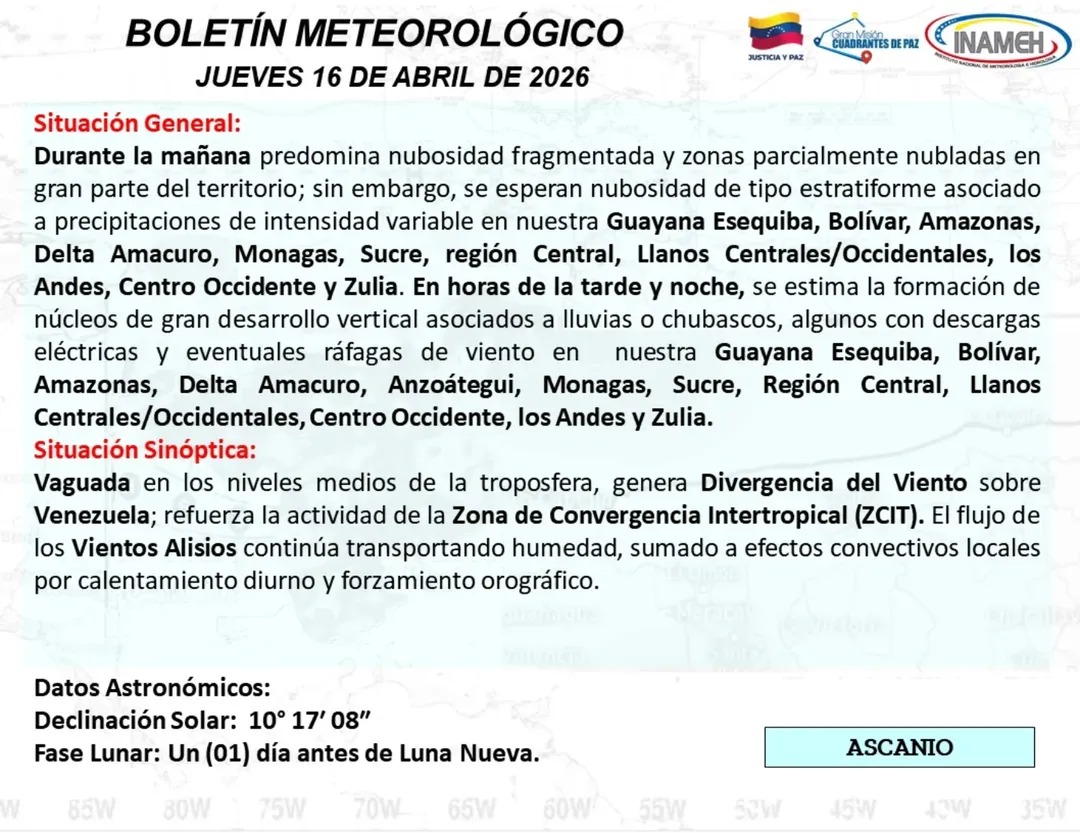En horas de la tarde- noche, se espera formación de núcleos generadores de lluvias o chubascos, algunos con descargas eléctricas y eventuales ráfagas de viento en Guayana Esequiba, Delta Amacuro, Bolívar, Amazonas, Anzoátegui, Sucre, Región Central, Monagas, Llanos Centrales y Occidentales, los Andes, Centro Occidente y Zulia.