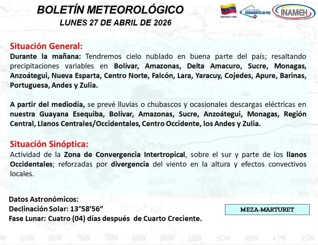 País.- El Instituto Nacional de Meteorología e Hidrología (Inameh) prevé para este lunes 27 de abril, precipitaciones de intensidad variable y cielo nublado en gran parte de Venezuela.