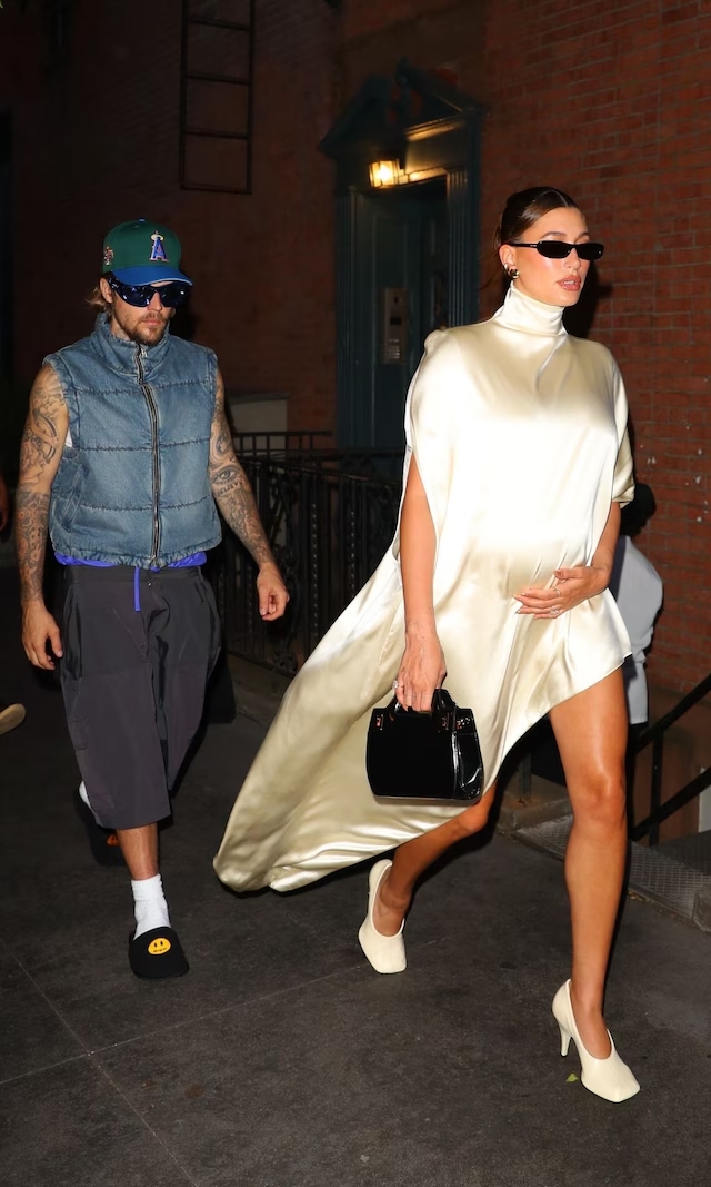 Recientemente Hailey lució un elegante vestido asimétrico de satén de seda diseñado por Phoebe Philo. Esta pieza, valorada en aproximadamente 2000 dólares, es un ejemplo perfecto de la tendencia del lujo silencioso. Su corte elegante la convierten en una elección ideal para cualquier ocasión, incluso durante el embarazo.