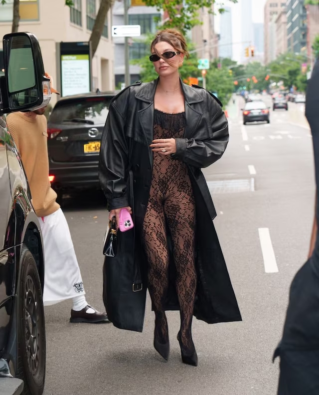 Hailey también fue capturada luciendo un hermoso conjunto de encaje de flores. El color negro y la combinación de una braga con una chaqueta de cuero y tacones le dieron un toque sofisticado y moderno. Este look demuestra que la maternidad no impide lucir elegante y sensual.
