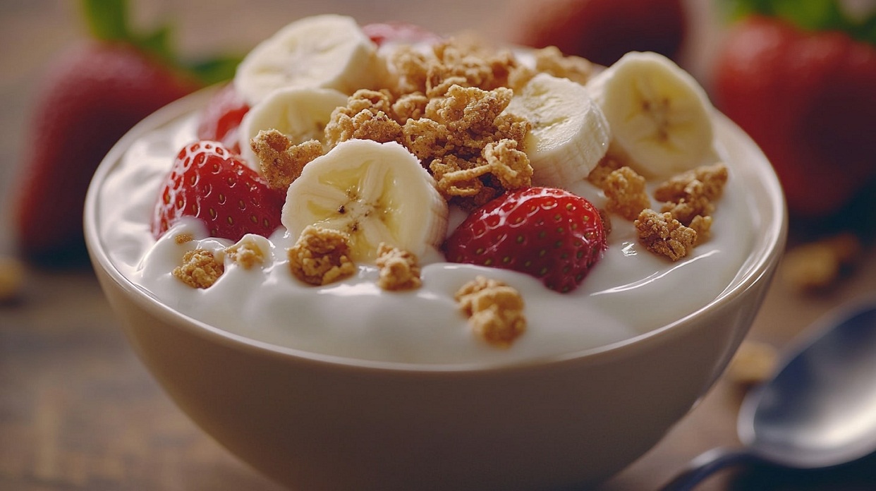 YOGUR CON CEREALES, FRESAS Y BANANA