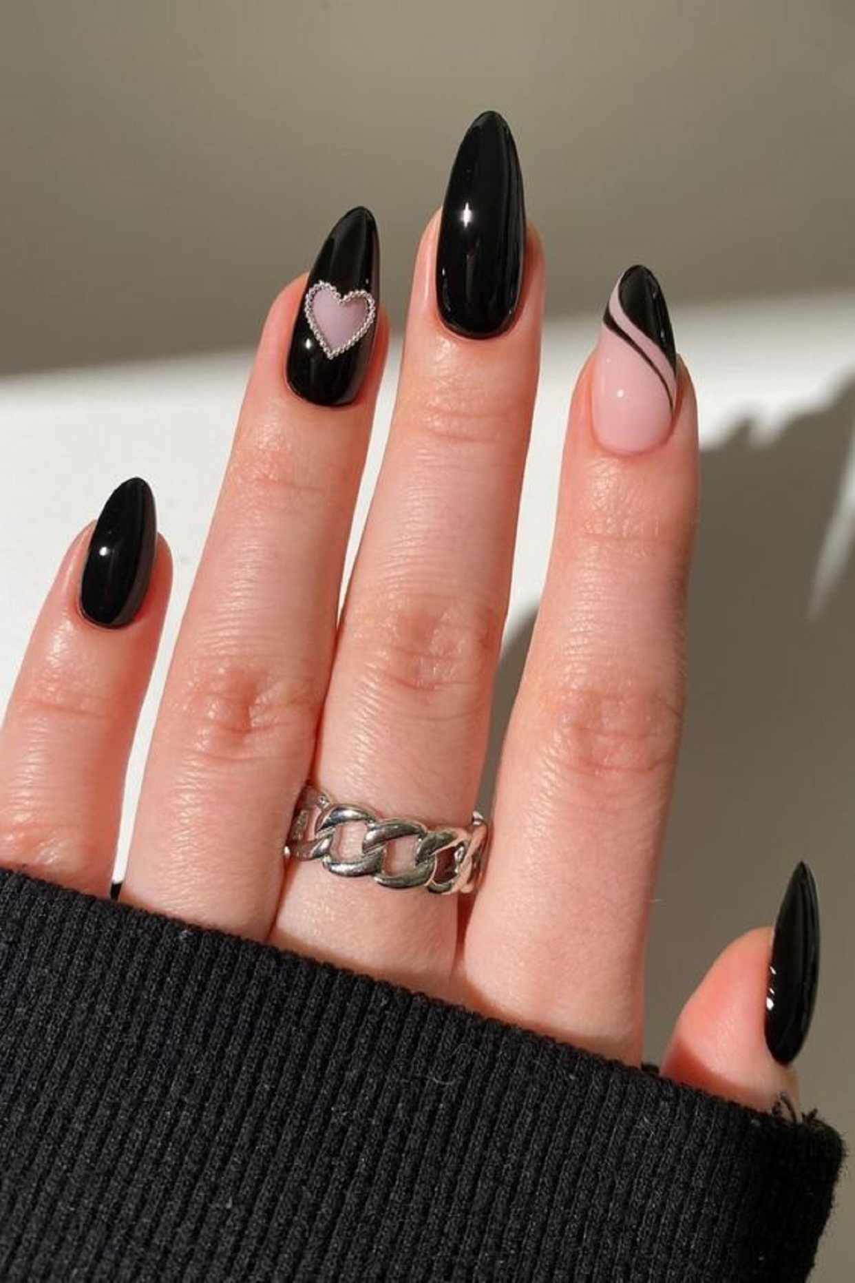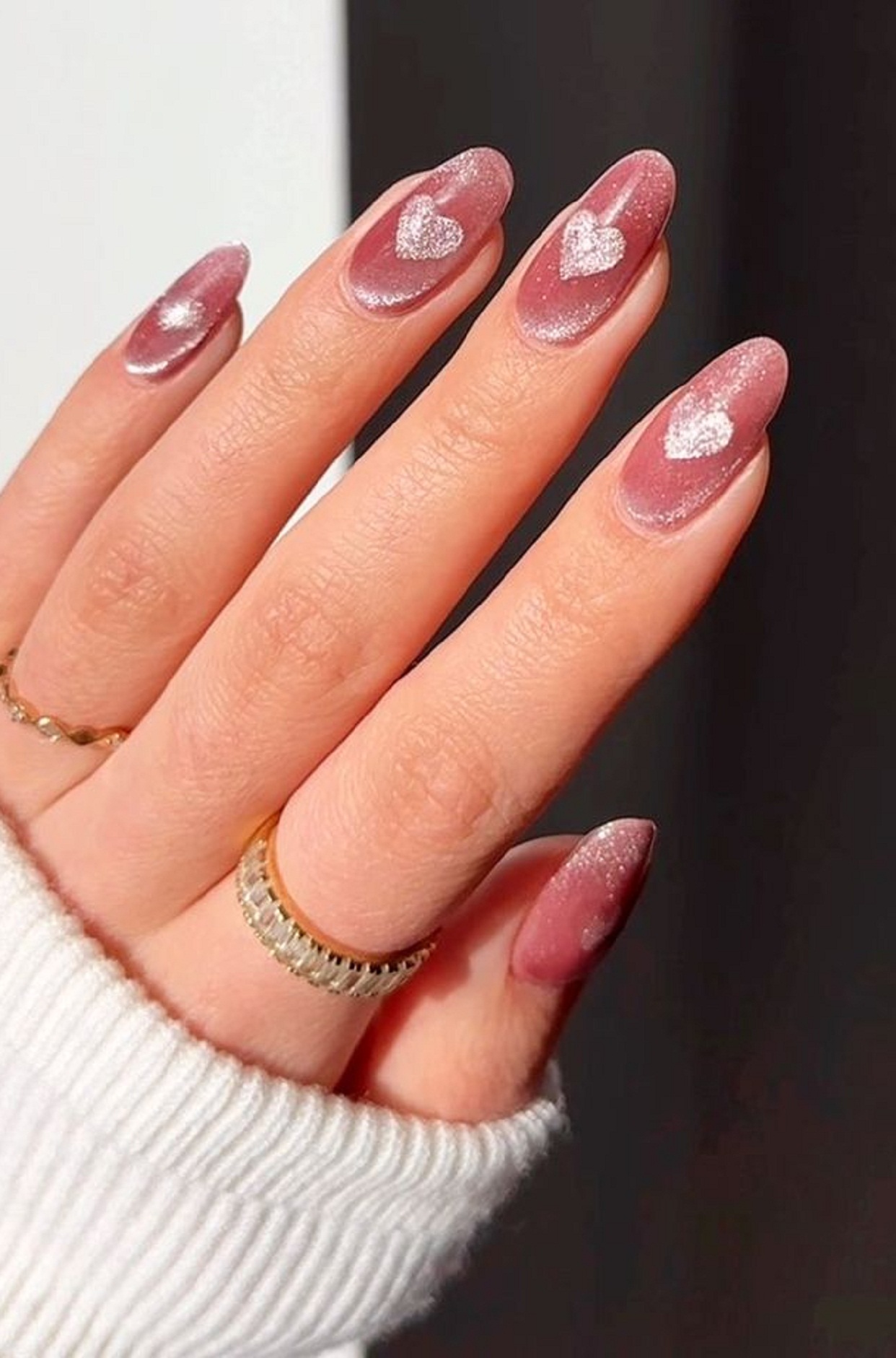 Con una capa de un esmalte rosa translúcido y un efecto cat eye. Con la ayuda de un imán para uñas en forma de corazón.