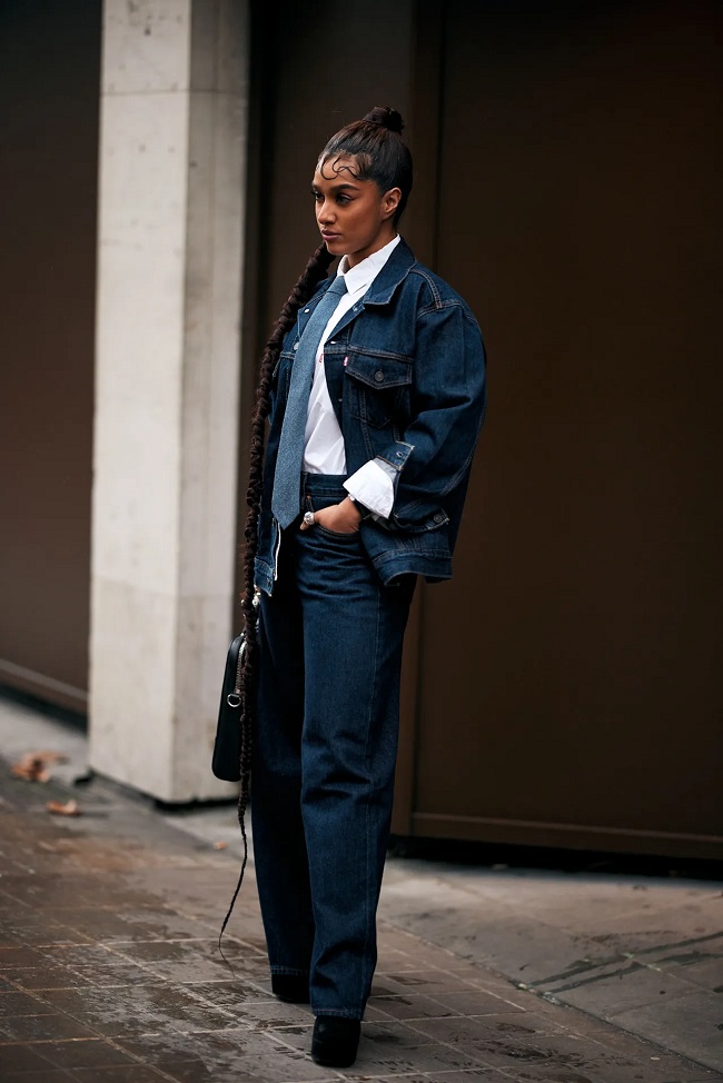 Una opción es transformar un total look en denim integrado por pantalones anchos y una cazadora oversize: una camisa blanca y una corbata en color azul perfectamente con un tono de índigo en oscuro.